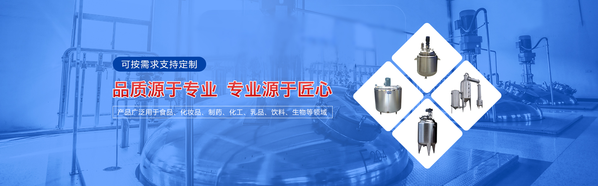 主要經(jīng)營(yíng)各種機(jī)械設(shè)備的制造、加工、銷售,主要產(chǎn)品有攪拌罐、冷熱缸、發(fā)酵缸、乳化罐、貯罐、移動(dòng)罐、夾層鍋、調(diào)配罐、脫氣罐、方槽、電加熱調(diào)配罐等各種食品機(jī)械和制藥機(jī)械。產(chǎn)品廣泛被用于食品、化妝品、制藥、化工、乳品、飲料、生物等領(lǐng)域,深受新老客戶的信賴與好評(píng)。